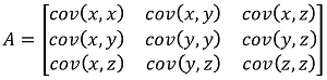 El cálculo de la mayor tendencia en dirección de los puntos de la figura se obtiene por medio del proceso PCA (Principal Component Analysis, Análisis de Componentes Principales) (17, 18). Este genera una matriz nxn, llamada matriz de covarianza A (ecuación 1) (17, 19), donde n es la dimensión de los puntos que componen la nube, en este caso, será 3. La matriz de covarianza A, engloba tres vectores principales. El primero es para indicar la tendencia mayor del conjunto de puntos (figura 2a), el segundo es la segunda tendencia (figura 2b) y la tercera es un vector perpendicular a los dos primeros (figura 2c), dejando ver un sistema de coordenadas 3D sobre la imagen tridimensional. La función cov (,), indica la covarianza entre las variables que se encuentran entre los paréntesis.