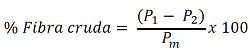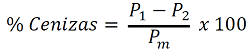 Donde P1 es el peso en gramos del crisol con cenizas, P2 es el peso en gramos del crisol vacío, Pm es el peso en gramos de la muestra.