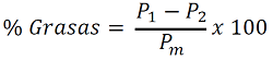 Donde P1 es el peso en gramos del balón con grasa, el P2 peso en gramos del balón vacío y Pm el peso en gramos de la muestra.