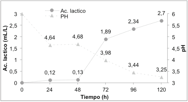 Los resultados de la figura 1, muestran que el pH afecta significativamente las actividades enzimáticas y la asimilación de nutrientes por parte de los microorganismos utilizados en la fermentación del almidón, siendo notorio que al aumentar la producción de AL el pH del caldo de cultivo cae rápidamente por debajo de 5 conduciendo a una disminución de la actividad celular e inhibiendo completamente su producción, ya que el pH del medio afecta significativamente el metabolismo bacteriano, que a su vez puede afectar el crecimiento celular y la producción de los metabolitos objetivo 30.