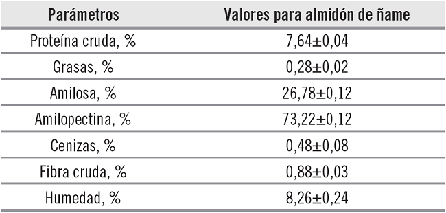Los resultados de los análisis bromatológicos del almidón de Dioscorea rotundata P. se presentan en la tabla 1. Los resultados mostrados en la tabla 1 establecen que el nivel de proteína se encuentra por encima del nivel permitido por la FDA en almidones de maíz (0,35%), por lo tanto, el almidón de ñame no es apto para ser utilizado en la elaboración de jarabes, debido a que presentó un mayor contenido de proteína (7,64%).