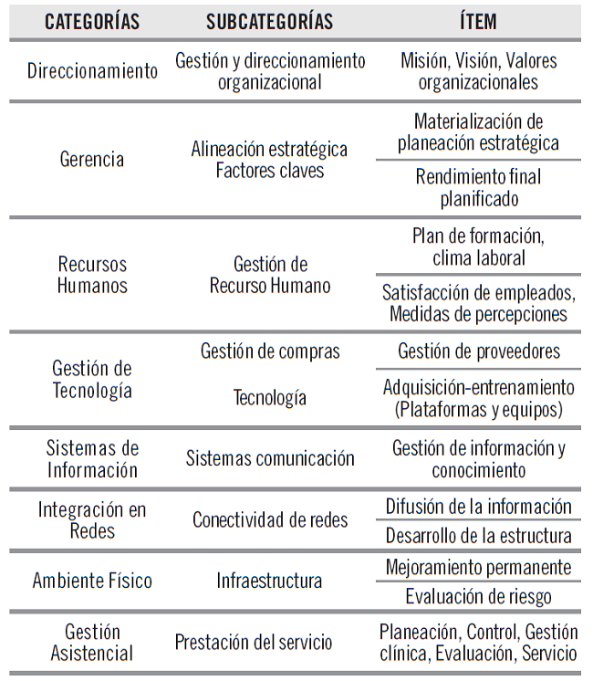 Se espera que las instituciones propendan por la productividad y el mejor aprovechamiento de los recursos disponibles, que en pocas palabras conlleva a mejores resultados en aspectos administrativos, por tanto el EFQM propone un sistema de gestión cimentado en procesos de mejora continua 7. En la tabla 1 se muestran las categorías evaluadas.