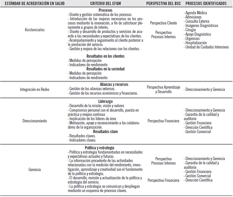 Teniendo en cuenta cada uno de los Estándares de Acreditación en Salud, los criterios propuestos por el EFQM, las perspectivas del BSC (8), se estableció la articulación entre los mismos tal como se presenta en la tabla 2.