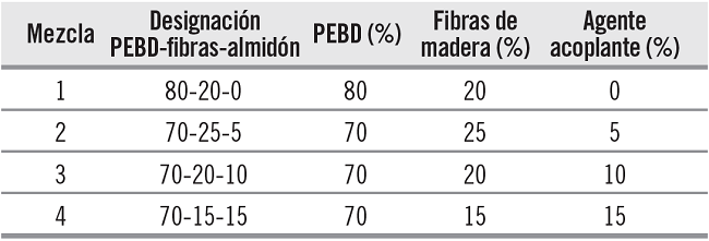La tabla 1 muestra el diseño de las mezclas realizadas, se presentan las proporciones de PEBD reciclado (matriz), el contenido de fibras de madera adicionado (refuerzo) y la proporción de almidón de papa modificado usada como agente acoplante.