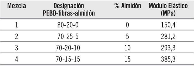 De otra parte, la lignina (polímero natural altamente ramificado), encargada de unir entre sí las fibras en la madera natural, aporta en el material compuesto mucha más rigidez que el PEBD. En este caso, pese a que la madera se encuentra en partículas muy pequeñas, éstas contienen lignina cuyas ramificaciones favorecen la unión de las partículas de aserrín con el almidón de papa y el polímero, produciendo un aumento en la rigidez del material compuesto para las cuatro mezclas.