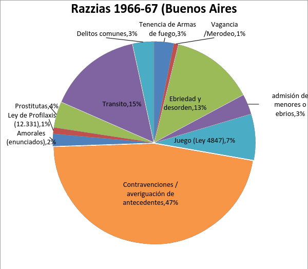 Con base en la información del diario construimos un indicador de la aplicación de las razzias entre 1966-67 en el territorio bonaerense. Entre las noticias del diario se contabilizaron 4752 detenidos, sobre una base más amplia de personas sometidas a cacheos, retenciones en la vía pública y revisión de antecedentes para las cuales se emplearon un total de 2900 efectivos policiales sobre las zonas de Arrecife, Azul, Bahía Blanca, Bragado, Berazategui, Dock Sud, Lanús, La Plata, Mar del Plata, Morón y San Martín. En la que no se incluyen detenciones por causa políticas.