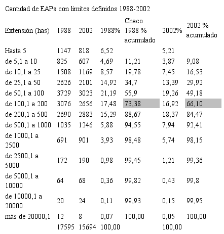 Tabla 1. Explotaciones agropecuarias por estrato en la provincia de Chaco, según Censos Agropecuarios 1988 y 2002.