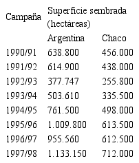 Tabla 2. Superficie sembrada con algodón (en hectáreas). Argentina y provincia de Chaco, 1990-98.
