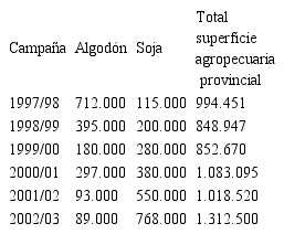 Tabla 3. Superficie sembrada con algodón, soja y total de la superficie agropecuaria de la provincia de Chaco, en hectáreas. Años 1997 a 2002.