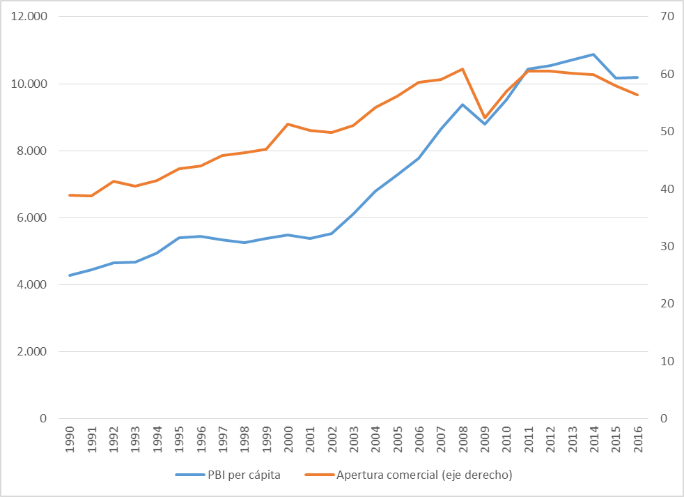 El gráfico 1 muestra la fuerte expansión del PBI per cápita de nivel mundial en los primeros años del siglo XXI. Durante el período 2003-2007 se expandió a un ritmo promedio anual del 2,7%. Tras la caída de 2008-2009 (-1,2%), tuvo lugar una expansión importante en 2010, y luego el crecimiento promedió un mucho más tenue 1,5% interanual. En consecuencia, se está frente a una etapa de menor dinamismo, que viene acompañada por un giro más llamativo respecto del comercio. En línea con el ímpetu de liberalización de las cuentas externas, la tendencia desde principios de la década de 1990 había sido a un mayor crecimiento del comercio respecto del producto, que en el gráfico de referencia se muestra mediante una medida estándar de apertura comercial (exportaciones más importaciones sobre el producto). Desde 1990 y hasta 2008, el indicador se expandió a una tasa interanual del 2,3%. Desde ese año al último dato disponible, en cambio, el índice se retrotrajo a un promedio anual del 1,2%. Es decir, la nueva etapa muestra un crecimiento más débil y que depende menos del intercambio internacional, lo que significa una caída de la demanda mundial (que, a su vez, se articula desde comienzos del decenio actual con un deterioro en los términos de intercambio para los productos que definen la canasta exportadora de muchos países de América Latina).