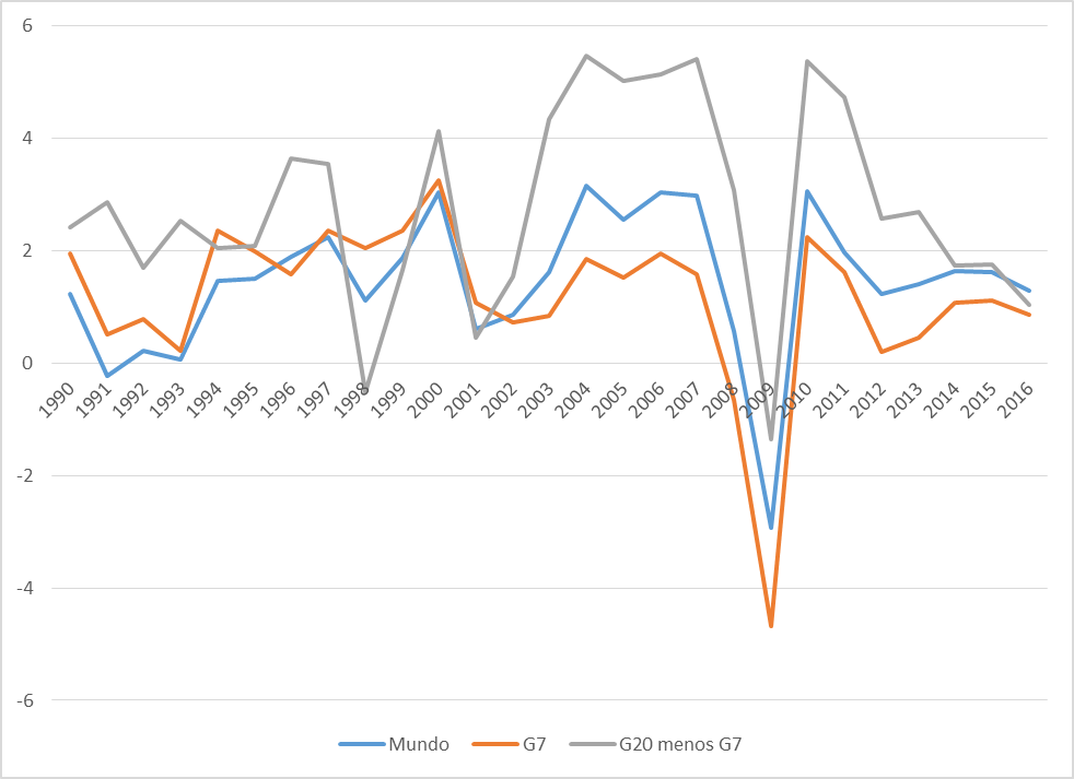 A los efectos de distinguir los “vectores” principales de las tendencias detectadas, se distinguen dos grupos de países que permiten tener consideraciones no solo en términos económicos, sino de política. Así, se contempla el comportamiento de los que se pueden considerar países centrales, que componen el G7, y lo que se podría identificar como semi-periféricos, naciones que participan del G20 (además del grupo anterior). Mientras que el primero explica alrededor de dos tercios de la economía mundial, el segundo supone aproximadamente el 85% del PBI global y las dos terceras partes del comercio total. Se trata de un ámbito de negociación plurilateral, que elude la “carga” de las negociaciones en los organismos multilaterales, y que no es de carácter vinculante. Aun así, se trata del espacio de negociación que da forma a gran parte de la gobernanza global. De hecho, el G7 original fue definitivamente ampliado a partir del estallido de la crisis, incluyendo a un conjunto más amplio de países de menor poder relativo, pero en claro ascenso.