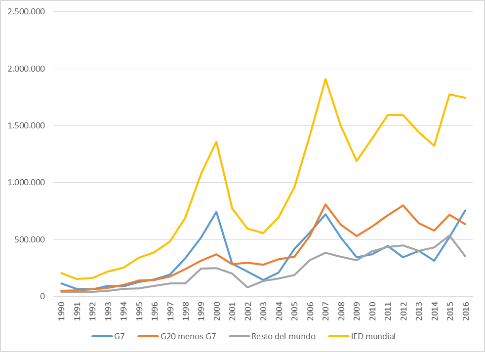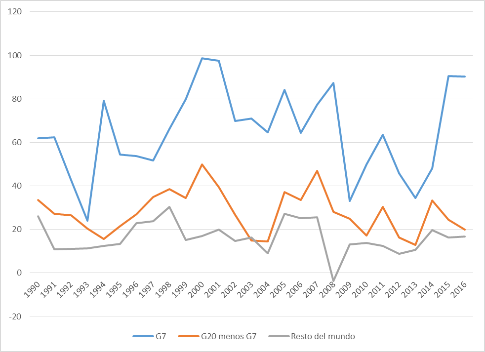 Este “vuelo” de los capitales hacia los países centrales a partir de 2016 se dirigió casi en su totalidad a fusiones y adquisiciones, las cuales representaron el 90,2% de los flujos que se dirigieron a los países del G7 ese año (gráfico 4). Si bien los niveles de este tipo de inversiones han sido sumamente elevados en los países centrales en todo el período, la tendencia se exacerba más durante las crisis. Es decir, durante toda esta etapa recesiva desde 2008, no sólo que las inversiones no han recuperado sus niveles previos, sino que las mismas se tratan casi exclusivamente de compras de empresas ya existentes y no de nueva formación de capital (ampliación de la capacidad productiva). Es sabido que durante las crisis se exacerba la tendencia a la centralización del capital, y éste parece ser el caso.