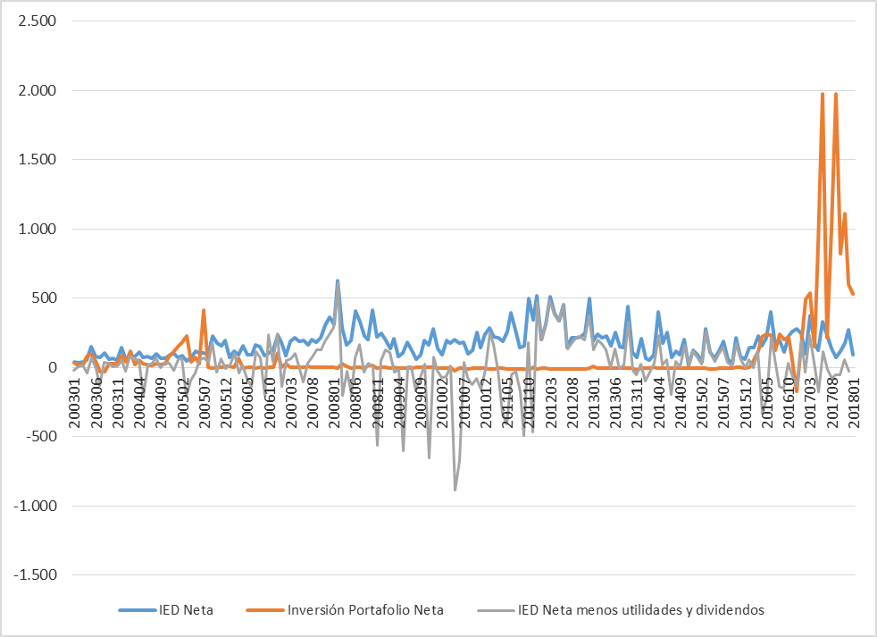 Las inversiones que claramente aumentan, y de modo destacado, son las de portafolio, es decir aquellas transacciones que implican compras de títulos de deuda (privada o pública en manos de privados) y participaciones accionarias por menos del 10% del total del capital de una empresa (gráfico 5). Normalmente, este tipo de inversiones se asocia a movimientos especulativos y de corto plazo. En cuanto asumió el nuevo gobierno, además de los beneficios mencionados antes en torno a la desregulación del mercado cambiario, se fueron reduciendo los requisitos de permanencia mínima de los capitales extranjeros en el país, hasta eliminarse por completo en 2017. Esto tuvo como consecuencia que las inversiones de portafolio pasaran de un promedio negativo de 5 millones de dólares de salidas mensuales por este concepto en el período 2008-2015 a un promedio mensual de entrada de 447 millones de dólares en 2016-2017, alcanzando picos de casi 2.000 millones en junio y septiembre de 2017.