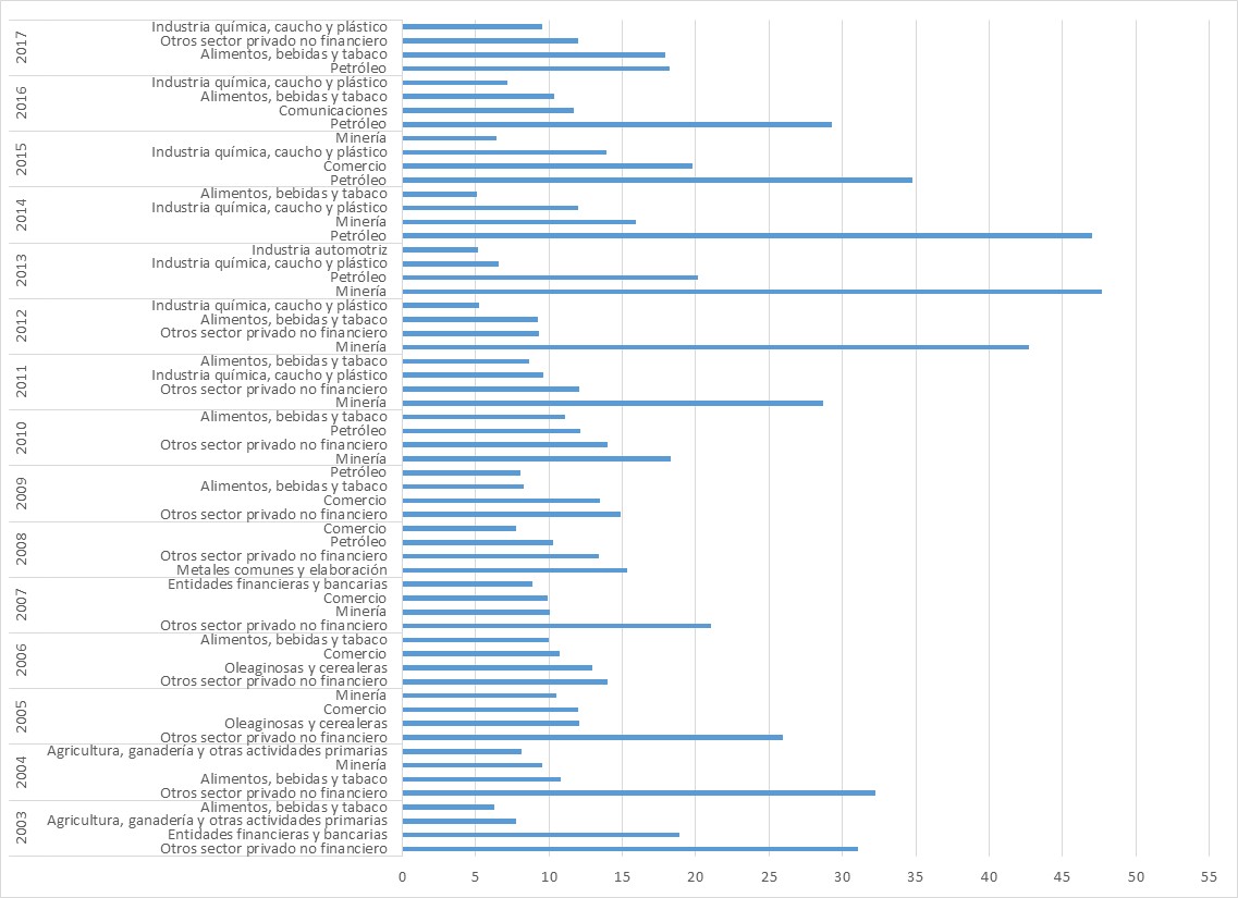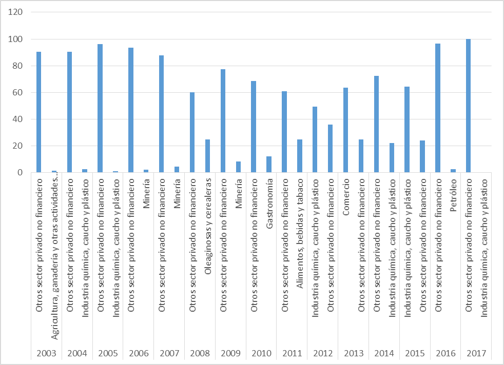 Es importante de resaltar que en las ramas particularmente favorecidas existe un eminente predominio del capital extranjero (Cantamutto y Schorr, 2018). Se trata de un puñado de empresas con fuerte control de la generación no solo de valor agregado, sino de exportaciones. En este sentido, y debido a que al mismo tiempo remiten utilidades, dividendos, compras de insumos y bienes intermedios, así como pagos de créditos (en ambos casos, fuertemente relacionados con sus casas matrices), se trata de un rol contradictorio, financiando y “desfinanciando” la balanza de pagos.