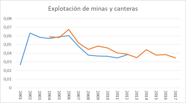 Fuente: elaboración propia con datos del INDEC.Entre los sectores que pierden, resalta que la industria, la construcción y la explotación de minas y canteras ya eran parte de los sectores que resultaban relegados en su participación en el valor agregado. En los tres casos, el declive proviene de la etapa anterior, sin diferencias significativas entre ambas estimaciones. Respecto de los volúmenes físicos, en los tres casos se alcanzan máximos entre 2010 y 2011, reduciéndose paulatinamente desde entonces. Tratándose de sectores de particular importancia política, en el marco de un crecimiento igual de raquítico, este rasgo no es trivial. El declive de la industria y la construcción explican gran parte del deterioro del mercado laboral con Cambiemos, que si bien hasta el momento no acusa un aumento sustancial del desempleo, sí muestra una modificación de la composición, por la cual ganan lugar la contratación informal y el sector auto-empleado, en ambos casos con menores derechos laborales.