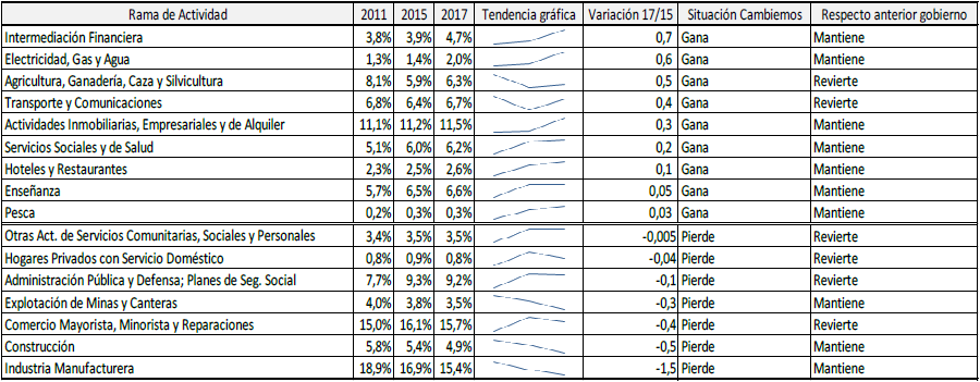 Entre los perdedores del nuevo esquema de políticas, es decir entre los rubros con mayor pérdida de incidencia relativa en el producto total, resaltan la industria manufacturera, la construcción, el comercio y la explotación de minas y canteras. Este último sector muestra una tendencia declinante incluso en niveles productivos, centralmente ligado al agotamiento de las explotaciones en actividad. Los otros tres sectores de actividad son los que más fuerza de trabajo contratan. En los tres casos, su pérdida de gravitación se explica en especial por la caída en 2016, recuperada solo en parte a nivel de producción en 2017 (comercio logra alcanzar su volumen de 2015). La construcción, de hecho, fue la actividad de mayor recuperación en términos físicos en la segunda mitad del año, explicado por la coyuntura electoral.
