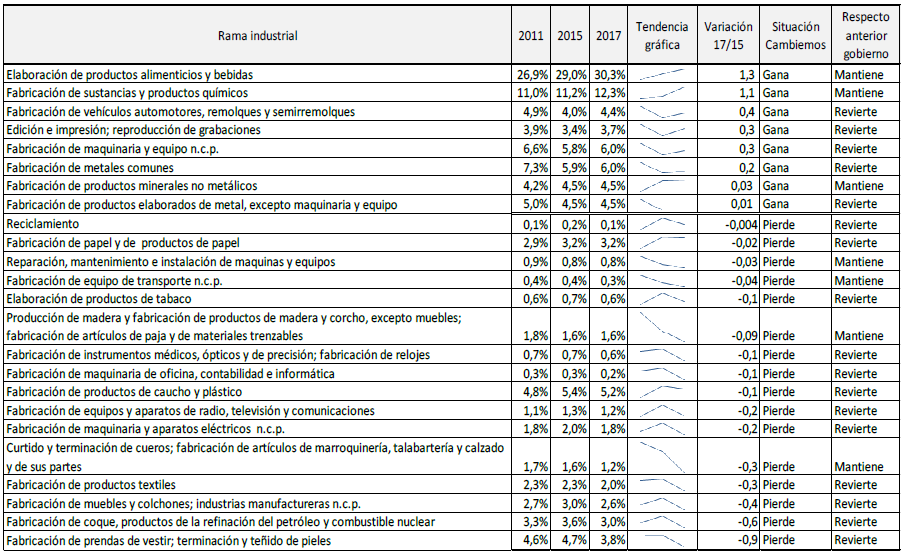 Al interior del ámbito fabril, es posible distinguir un núcleo muy reducido de actividades que recuperan su dinamismo, ganando participación dentro del producto sectorial (cuadro 3). Se trata de alimentos y bebidas, químicos, automotriz, edición e impresión, maquinaria y equipo, metales comunes, metales no minerales y metalúrgica. Los dos primeros casos, junto a minerales no metálicos, mantienen la misma tendencia a la expansión al interior de las manufacturas que mostraban durante el gobierno anterior, pasando de explicar el 44,7% del valor agregado manufacturero al 47,1% del mismo (en 2004 explicaba el 40,9%).