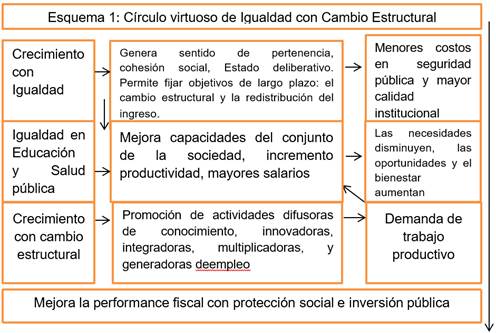 La argumentación Cepalina pasa por resaltar que una mayor igualdad en materia de derechos, oportunidades y bienestar promueve un mayor sentido de pertenencia a la sociedad y, con ello, una mayor cohesión social (ver Esquema 1). Sin cohesión social y un Estado deliberativo difícilmente se pueden superar -como comunidad y país-, los desafíos de un mundo más competitivo y complejo y llevar a cabo una política de industrialización (cambio estructural) y social (redistribución progresiva de ingresos).