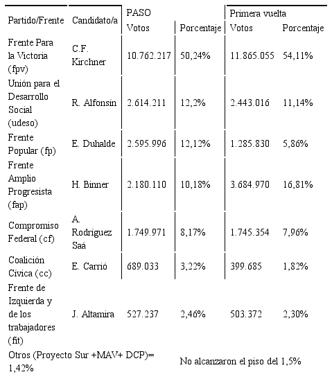 En el primer proceso eleccionario en el que se aplicaron las PASO (2011) debía elegirse presidente, 130 diputados nacionales y 24 miembros del Senado. En esa ocasión, a nivel presidencial se presentó la mandataria Cristina Kirchner, quien competía como candidata única del FPV, cuyo triunfo final aparecía como cuasi asegurado. Ante esa situación, para evitar profundizar su fragmentación, los partidos opositores también presentaron listas unitarias; con lo cual no hubo competencia en ninguna de las fuerzas políticas que entraron en la carrera presidencial en esa elección.