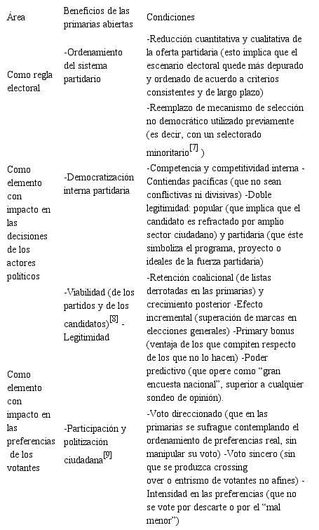 En la siguiente tabla, se exhiben los beneficios teóricos consignados, cruzados por los tres elementos que se busca analizar en este trabajo (los efectos de las PASO como regla electoral, su influencia sobre las preferencias y decisiones de los actores políticos y su impacto sobre las preferencias y expectativas ciudadanas). Luego, se mencionan las condiciones para lograr un nivel mínimo aceptable que garantice su posible cumplimiento efectivo, basadas en los preceptos teóricos generales sobre la temática y sobre las consecuencias observadas empíricamente respecto del funcionamiento de mecanismos con características similares.