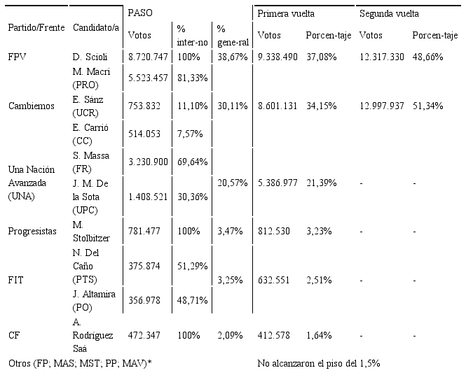 Nuevamente, las PASO se pusieron en práctica en 2015 para las elecciones presidenciales y de renovación parcial legislativa[16]. A nivel presidencial, en el oficialismo, Daniel Scioli compitió como único candidato. Las principales coaliciones de la oposición, forjadas para competir en las PASO, fueron: Cambiemos, que llevaba a Mauricio Macri (del PRO, pivote de la alianza), y UNA, que postulaba a Sergio Massa (FR)[17]. En ambos casos, se trató de coaliciones ad hoc, personalistas y heterogéneas, cada una de las cuales presentó una competencia interna testimonial en las PASO[18].
