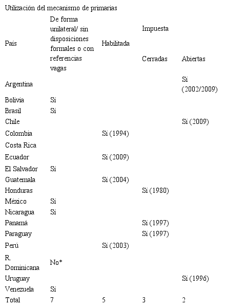 El sistema de primarias (o internas) abiertas -en alguna de sus diversas variantes- fue propuesto, incorporado y/o utilizado en casi todos los países de América Latina, a lo largo de los últimos años. No obstante, en la mayor parte de los países latinoamericanos no existen disposiciones formales que impongan la realización de primarias, sino que en su mayoría éstas han sido implementadas unilateralmente por algún partido. Y en los que existen tales disposiciones (Chile y Uruguay), no se obliga a los ciudadanos a participar en ellas.