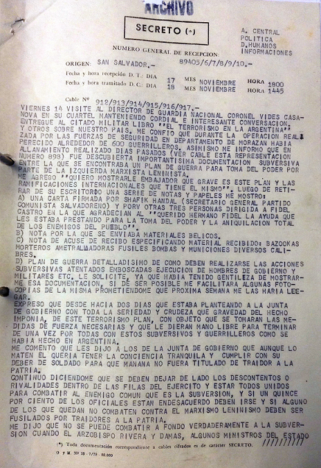 gestión difícil, produjo permanentemente informes sobre el tema, que elevaba independientemente de sus funciones, a la Secretaría General del Comando en Jefe del Ejército, de acuerdo con las órdenes impartidas por el señor Secretario General, a quien mantuvo al tanto de la situación en El Salvador. Estos informes han resultado útiles a nuestra inteligencia por la información directa que provenía de medio.[54]
