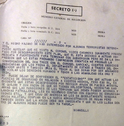 Esa conversación con el director de la Guardia Nacional es determinante, ya que le habló de un “plan de guerra para [la] toma del poder” por parte de la “izquierda marxista leninista” que había sido encontrado en un allanamiento. Como sostenía que el mismo tenía “ramificaciones internacionales,” le envió una copia unas semanas después.[40] De acuerdo al director de la Guardia Nacional, “hacía dos días que estaba planteando a la Junta de Gobierno con toda la seriedad y crudeza (...) que se tomaran las medidas de fuerza necesarias y que le dieran mano libre para terminar de una vez por todas con estos subversivos y guerrilleros como se había hecho en Argentina”.[41] Bianculli transmitió la preocupación de Vides Casanova y del ministro de defensa y su impresión de que los estaba “frenando” el embajador de Estados Unidos en El Salvador: “Es evidente que están desesperados por recibir ayuda de países amigos”.[42] Con esta información a mano, Bianculli no dudó en afirmar, en una conversación que tuvo con el embajador White, que “tenía noticias que en la subversión y guerrilla salvadoreña, principalmente en departamento de Morazán y Bolsón de Zazalapa, actuaban extremistas argentinos, cubanos, nicaragüenses y otros mercenarios”.[43] En mayo de 1981, por la radio clandestina “Venceremos”, oyó que el “grupo montonero” había informado sobre la presencia de dos asesores militares argentinos en El Salvador.[44]