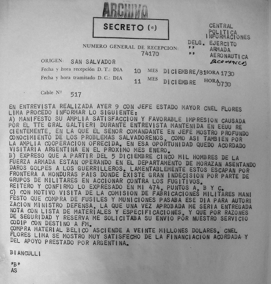 De acuerdo a los documentos secretos del Banco Central de la República Argentina del año 1982, se autorizó a Fabricaciones Militares a financiar la exportación de material bélico secreto a El Salvador por 20 millones de dólares. Dichos documentos explicitan que las razones de la exportación de material bélico en el mercado internacional responde a “razones de interés político y estratégico”, aprobadas por el Comando en Jefe del Ejército.[79] El 13 de marzo de 1982 la Cancillería Argentina galardonó a Rafael Flores Lima con la Orden de Mayo al Mérito.
