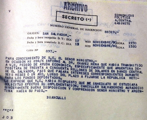 El primer pedido de ayuda financiera que hizo El Salvador a través del canciller Chávez Mena fue transmitido por Bianculli en noviembre de 1980.[81] El depósito al Banco Central salvadoreño se efectivizó el 26 de enero de 1981 y se trató de un préstamo de 20 millones de dólares para nivelar la balanza de pagos.[82] Este préstamo está listado en un resumen que la Cancillería Argentina comunicó a la embajada argentina en Washington, en el cual se consignaron los apoyos dados al gobierno salvadoreño, como las donaciones de 5000 toneladas de trigo que se hicieron primero en 1980 y luego en 1981.[83]