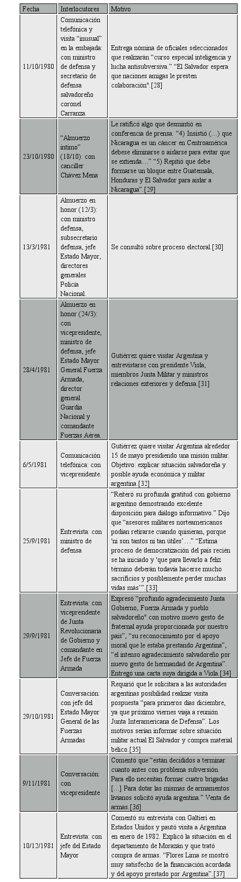 Además de todas las citadas misiones diplomáticas que estrecharon lazos entre El Salvador y Argentina existió una comunicación fluida y sistemática entre el embajador argentino y los militares de la línea dura salvadoreña: el vicepresidente y comandante general de las Fuerzas Armadas el coronel Jaime Abdul Gutiérrez; el ministro de defensa general José Guillermo García; el jefe del Estado Mayor General de la Fuerza Armada general Rafael Flores Lima; y el director general de la Guardia Nacional coronel Vides Casanova. En el siguiente cuadro mostramos un ejemplo de los intercambios que pudimos sistematizar informados en la comunicación que se mantuvo entre la embajada argentina en El Salvador y la Cancillería argentina: