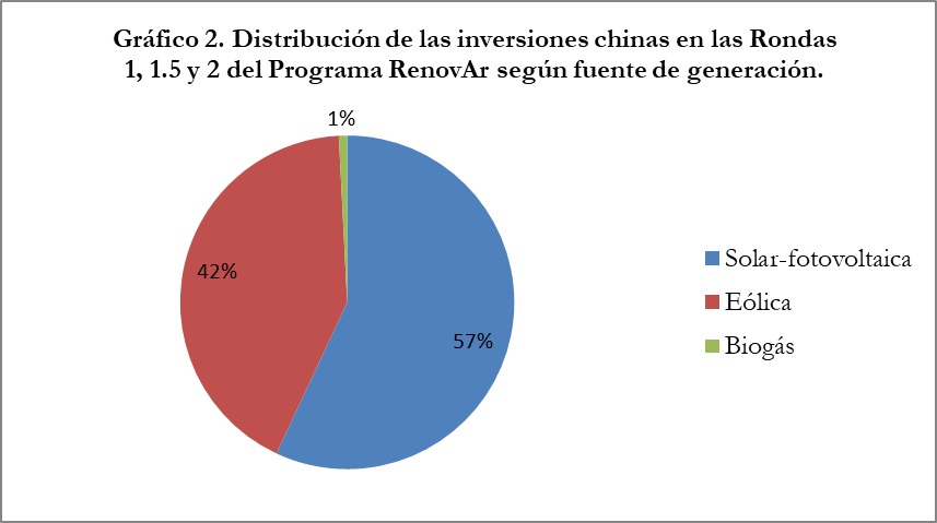 Finalmente, la “Ronda 2” (noviembre y diciembre de 2017) de licitaciones del Programa RenovAr tuvo un total de 88 adjudicados en dos fases (66 en la primera, 22 en la segunda) por un grueso de 2.043 MW, a un precio ponderado de 51,48 MW/h. En ella se hicieron presentes seis tecnologías de generación divididas del siguiente modo: eólica 993,4 MW, solar 816,4 MW, biomasa 143,2 MW, biogás 56,2 MW, pequeños aprovechamientos hidroeléctricos 20,8 MW y biogás generado en base a rellenos sanitarios 13,1 MW. Aquí es donde puede verse la menor participación relativa de capitales con domicilio explícitamente declarado en la República Popular China, siendo empresas de ese origen 299,90 MW en solar-fotovoltaica y 9,60 MW en biogás, representando el 36,74% y el 17,08% de lo asignado en cada una de esas tecnologías, respectivamente.
