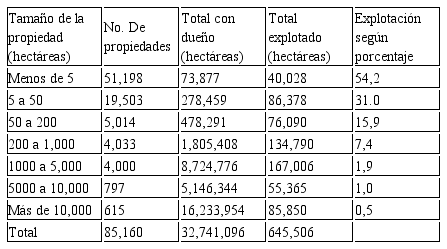 En una comparación a gran escala se puede ver como en 1950 un porcentaje muy pequeño de propietarios era dueño del 65.30 por ciento del total de la tierra, mientras que en 2013 el porcentaje de esos mismos grandes propietarios, en cuanto a extensión de la unidad productiva, era del 23.14 por ciento del total, en cuanto al minifundio en 1950 el 60.12 por ciento de los propietarios eran dueños de unidades de menos de cinco hectáreas con apenas el 2.23 por ciento del total de tierras, en 2013 había 507,243 propietarios de ese tipo con un 2.13 por ciento del total de la tierra (Censo Nacional Agropecuario 1950, citado en Dunkerley, 2003: 43).