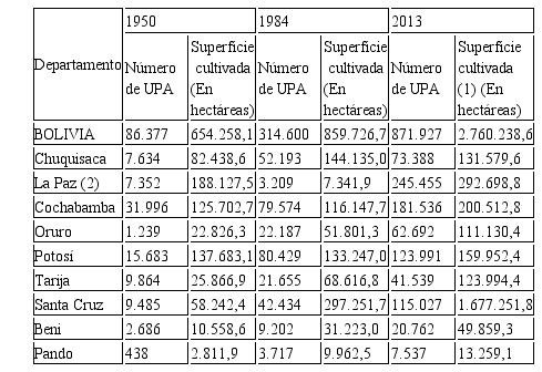 Las Unidades de Producción en cuanto a la superficie cultivada igual demuestran la diferencia. En 1950 los tres departamentos más importantes respecto a superficie cultivada eran La Paz con un 28.75 por ciento del total, Potosí con 21.04 por ciento y Cochabamba con 19.21 por ciento, mientras que Santa Cruz apenas abarcaba el 8.9 por ciento. En el Censo de 1984 ya hay una diferencia importante, pero debido a los problemas de su aplicación es difícil decir que tan real es la información, sobre todo en La Paz que en el Censo anterior era el principal productor. En ese año el departamento oriental ya mostraba un repunte importante al tener el 34.58 por ciento del total cultivado. Pero el Censo de 2013 muestra claramente esta transformación, Santa Cruz cultivó el 60.76 por ciento de la superficie total, mientras que La Paz tendría un 10.60 por ciento, Cochabamba 7.26 por ciento y Potosí el 5.79 por ciento del total, siendo nuevamente los tres departamentos que siguieron en importancia (INE, 2015b). El aumento es espectacular, más si se toma en cuenta que los grandes propietarios se concentran en esa área.