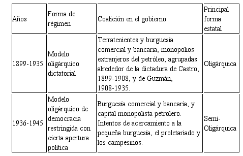 A la muerte de Gómez sus sucesores se apoyaron en la burguesía comercial y bancaria y también en el capital monopolista petrolero, con intentos de acercamiento a la naciente clase media, el proletariado y los campesinos en una forma estatal en que podemos catalogar de semioligárquica. No dudaron de la lealtad del ejército, pero no tomaron en cuanta el descontento, tanto de los mandos medios de unas fuerzas armadas cada vez más profesionalizadas ante la monopolización de las posiciones superiores por una camarilla ligada a Gómez, como de las nacientes clases medias que eran excluidas del poder político.