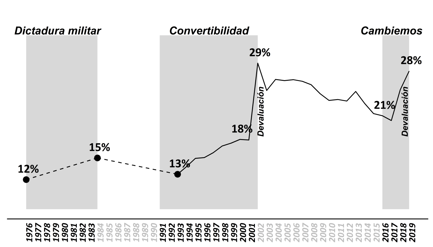 Los aumentos de tarifas y tasas de interés, pero especialmente la devaluación, impulsaron el incremento la inflación, que totalizó un 300% en todo el mandato de Macri, siendo 2019 el año de mayor suba de precios desde 1992. Esto deterioró severamente las condiciones sociales. Por usar una fuente comparable, se ilustra esta aseveración con los datos del Observatorio de la Deuda Social de la Universidad Católica de Argentina (UCA), que halló un 29% de los hogares en condiciones de pobreza en diciembre de 2015, valor que creció al 40,8% para el mismo mes de 2019[5].