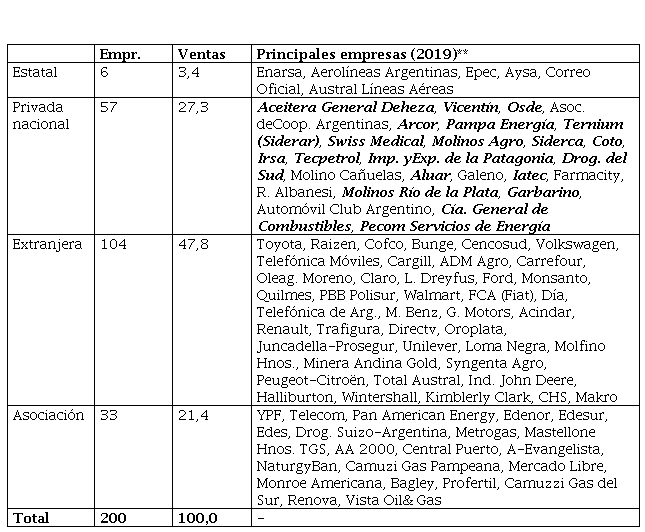 ** Las empresas se ordenan de modo decreciente en función del monto de sus ventas en 2019. En la categoría “privada nacional”, las firmas resaltadas pertenecen a grupos económicos.