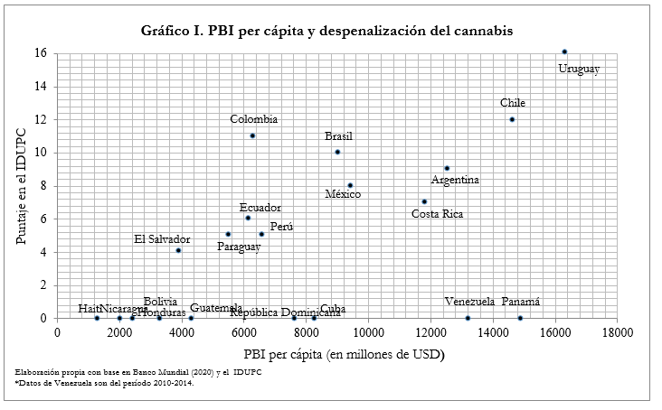 Bajo estos argumentos, parece oportuno considerar el modo en que la aprobación de reformas de despenalización del uso personal de cannabis se encuentra asociada al desarrollo económico. A primera vista, rápidamente, emergen a nivel global un importante número de excepciones. En paralelo a que los países petroleros de Oriente Próximo castigan con extrema severidad a quienes consumen o cultivan cannabis, en la mayoría de los países que integran la Unión Europea (fundamentalmente entre los de más altos ingresos) la legislación prevé la posibilidad de encarcelamiento ante estas conductas (EMCDDA, 2021). No obstante, es posible observar cierta correlación entre estas variables en el continente americano. Canadá ha instalado recientemente un régimen de gestión legal de la planta al mismo tiempo que en la amplia mayoría de los estados de EE.UU (especialmente, entre aquellos de mayores ingresos) se ha introducido alguna forma de despenalización o regulación, tanto en la dimensión medicinal como no medicinal (NORML, 2021).