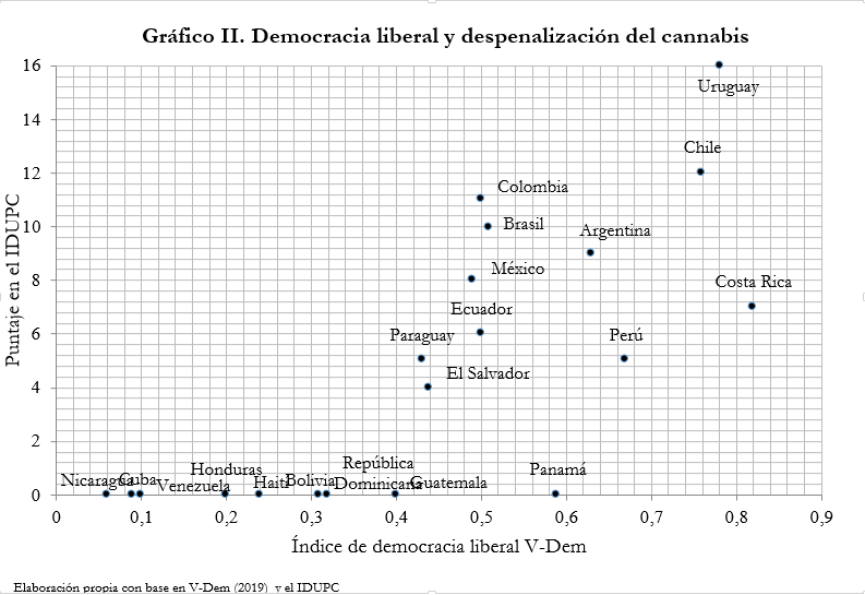 Como ilustra el Gráfico II, del mismo modo que en el análisis económico precedente, aquí también se observa una asociación positiva en el cruce de la fortaleza de la dimensión liberal de las democracias y el nivel de despenalización alcanzado respecto al uso personal de cannabis. En principio, de los nueve países que no han sumado puntos en el IDUPC, ocho asumen los valores más bajo en la medición de la garantías individuales ofrecidas por su régimen político. Sin embargo, este mismo dato también permite advertir que, en valores bajos, las importantes variaciones que presenta esta variable política no correlacionan con una tendencia hacia la despenalización. Por ejemplo, a pesar de posicionarse en puntos alejados sobre el eje de abscisas, Nicaragua y Guatemala, cuentan con el mismo resultado en términos de despenalización. Así, la relación graficada no se extiende de manera lineal para el conjunto de casos. Por otra parte, aunque en las naciones que superan el valor medio en la variable política evaluada la asociación parece ser relativamente más fuerte, aún entre ellas persiste cierto grado de dispersión. A modo de ilustración, mientras Ecuador y Colombia consiguen puntajes semejantes en el Índice de democracia liberal, el segundo casi duplica al primero en la escala de despenalización del uso personal de cannabis. No obstante esto, la visualización permite constatar que la tendencia de despenalización ha proliferado con más fuerza en los países cuyos sistemas políticos conceden mayores garantías individuales.