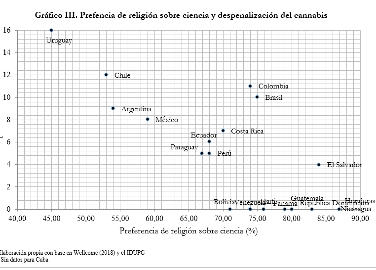 De esta manera, el conocimiento existente haría esperable que países más religiosos adopten marcos normativos menos despenalizantes en materia de cannabis. Sin embargo, si se pondera el nivel de religiosidad de cada país a partir del porcentaje de la población sin filiación religiosa (es decir, su reverso), no parece haber correlación alguna entre dicha variable y los puntajes alcanzados por los casos en el IDUPC. En parte, esto responde a que la región presenta porcentajes de irreligiosidad más o menos parejos, sólo con unas pocas excepciones. Si la religión parece evidenciar escasa relación en base a este indicador, devine pertinente considerar sí, más bien, es en los modos de ser vivenciada que existe algún factor asociado con en el carácter que adoptan las legislaciones en materia de cannabis.