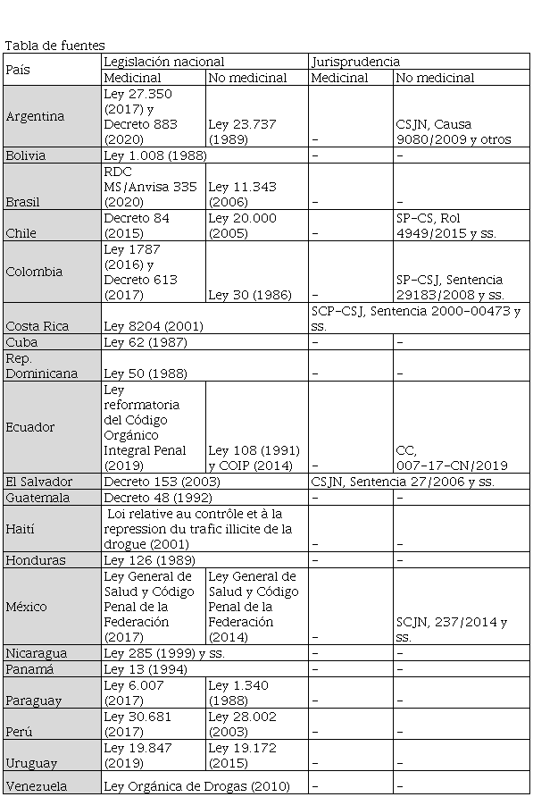 Preliminarmente, es preciso aclarar que los valores generados para cada país respecto a sus normas sobre el uso de cannabis no reflejan necesariamente el modo en que esta es aplicada ni estiman los grados reales de persecución penal a los que se ven sometidos sus consumidores. Por ejemplo, las inespecificidades contenidas en varias leyes nacionales llevan a que los usuarios de cannabis sean muchas veces alcanzados por penas previstas para disuadir el tráfico ilícito (CEDD, 2014). De manera similar, la respuesta penal suele efectivizarse de manera despareja en función de la ubicación geográfica, pertenencia socioeconómica, o género de los consumidores (TNI & WOLA, 2010). A su vez, las consecuencias generales de estas normas pueden variar entre los países con arreglo a una multiplicidad de factores, cómo la prevalencia de consumo de cannabis, los legados de violencia institucional, el contexto político, entre otros. No obstante esto, las normas que rigen en la materia, además de constituir un objeto de análisis ineludible, permiten una primera aproximación sobre las formas concretas que adquiere el control del uso de cannabis en la región. Más importante aún, la examinación y comparación de mismas echa luz sobre un fenómeno distintivo aunque análogo: hasta qué punto los estados latinoamericanos han reconocido formalmente el derecho a usar la planta y sus derivados con fines personales.