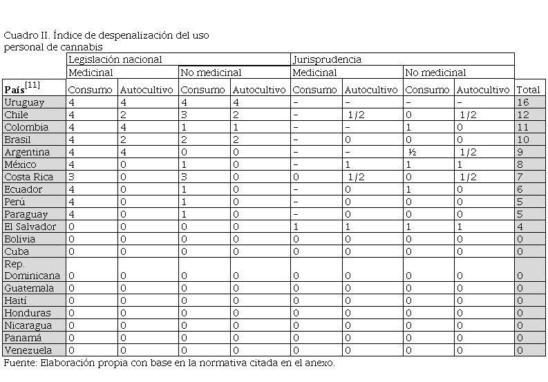 En el Cuadro II se observan, de mayor a menor, los puntajes obtenidos por cada país de la región en el índice de despenalización del uso personal de cannabis. Rápidamente resalta la existencia de dos grupos que, con niveles variados de heterogeneidad interior, dividen a la mitad a la población de casos analizada. Por un lado, los países que se han orientado con diferentes intensidades hacia la despenalización formal de las conductas vinculadas al uso individual de cannabis y, por el otro, aquellos que no lo han hecho.
