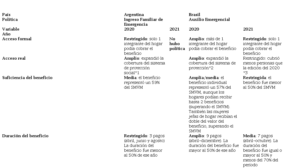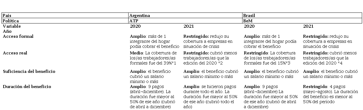 Relativo al acceso formal, en las políticas que buscaron sostener los ingresos y el empleo de los/as trabajadores/as formales, ambos países siguieron una estrategia amplia en el 2020. En los dos programas principales, el ATP en Argentina y el BeM en Brasil, el principal requisito para ingresar consistió en que las empresas demostraran pérdidas en su facturación, lo que fue fácil demostrar en un contexto de restricciones. Respecto al acceso real, las políticas destinadas al trabajo formal fueron caracterizadas como amplias en Argentina y como restringidas en Brasil durante el 2020. Esto tiene que ver con que en Argentina, el ATP, logró cubrir a gran parte de la población trabajadora formal (un 37%). En cambio, en Brasil, la cobertura fue del 15% respecto al total de asalariados/as formales en ese país. En el año 2021, ambos programas continuaron, pero la cobertura real fue mucho mayor en el caso argentino. En términos de la suficiencia de los beneficios, tanto el ATP como el BeM fueron caracterizados como amplios o suficientes, ya que no hubo pérdida de ingresos de los/as trabajadores/as formales en este contexto de crisis, ya que garantizaron, al menos, un salario mínimo. En relación con la duración de los beneficios, el caso argentino resaltó por la continuidad de sus políticas. El ATP fue reemplazado por un nuevo programa, el REPRO II, que duró todo el 2021. En el caso de Brasil, durante el 2021, el beneficio monetario del BeM duró solo 4 meses y no hubo otro programa que lo reemplazara.