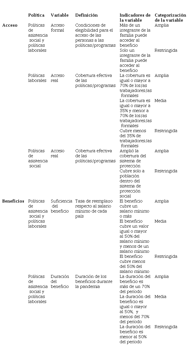 Se analizaron las políticas de protección social de emergencia durante la pandemia en dos dimensiones: la asistencia social y políticas laborales hacia el trabajo formal y las empresas[2]. En cuanto a la asistencia social, se entendió como el conjunto de programas de transferencias y subsidios públicos, normalmente financiado mediante impuestos (Cecchini & Martínez, 2011). Estos programas están dirigidos a personas que viven en situación de vulnerabilidad o pobreza y tienen como objetivo proveer de ingresos y acceso a políticas y servicios. En el caso de Brasil, se analizó el “Auxilio Emergencial” (en adelante AE); y en el caso de Argentina, el “Ingreso Familiar de Emergencia” (en adelante IFE). Respecto a las políticas destinadas al trabajo formal, se entendieron como “el conjunto de normas y acciones destinadas a proteger al trabajo decente y facilitar la protección de los trabajadores y sus dependientes” (Velásquez Pinto, 2017, p.105). Estas regulaciones laborales se expresaron en diferentes políticas adoptadas durante la pandemia, aunque para el desarrollo del artículo se analizaron, en Brasil, el Programa “Beneficio Emergencial de Preservação do Emprego e da Renda” (en adelante BeM); y en Argentina, el Programa de Asistencia de Emergencia al Trabajo y la Producción (en adelante ATP). Para pensar el grado de protección y las características de las políticas de asistencia social y las políticas de sostenimiento del ingreso orientadas al trabajo formal, se analizaron dos componentes de la estructura de protección social: el acceso y la generosidad de los beneficios[3]. Estas variables analíticas siguen a la literatura clásica en el estudio de sistemas de bienestar de América Latina (Arza et al., 2022; Blofield, 2019; Castiglioni, 2018; Garay, 2016; Martínez Franzoni & Sánchez-Ancochea, 2019). A su vez, el presente artículo continúa con trabajos de investigación que propusieron esquemas similares de análisis en el marco del contexto de la pandemia (Arza, 2021; Blofield et al., 2021; Espinosa et al., 2021; Massard da Fonseca et al., 2020; Sátyro & Machado, 2022). A partir de esas dos dimensiones se hizo una caracterización de la estructura de protección social durante la pandemia en ambos países (2020-2021). En la Tabla 1 se operacionalizan las variables que se consideraron para el análisis.