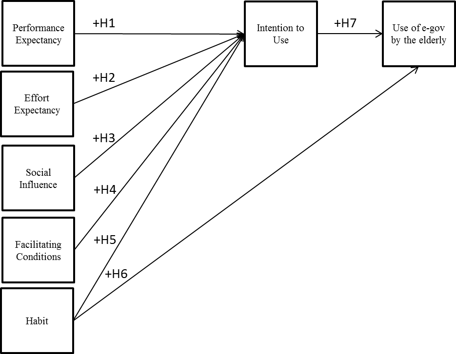 According to the literature review, Figure 1 presents a model which best serves the purpose of this study, which aims to identify what are the elements that determine the adoption of e-government by the elderly in Brazil. The visual representation facilitates the understanding of the theoretical model (WHETTEN, 1989).