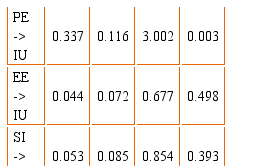 Table 4 presents the coefficient values between the constructs and their respective Student's t-test. The values were estimated by the bootstrapping technique. All relation values, except for Effort Expectancy and Social Influence regarding Intention to Use, presented Student's t-test higher than 1.96 (significance level = 5%). The t-test value for Effort Expectancy with Intention to Use was 0.677, with a p-value of 0.498, and the t-test value for Social Influence with Intention to Use was 0,854, with p-value of 0.393. These values mean that the constructs of Effort Expectancy and Social Influence do no influence the Intent for Adoption of the program, thus not confirming Hypothesis 2 and 3.