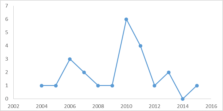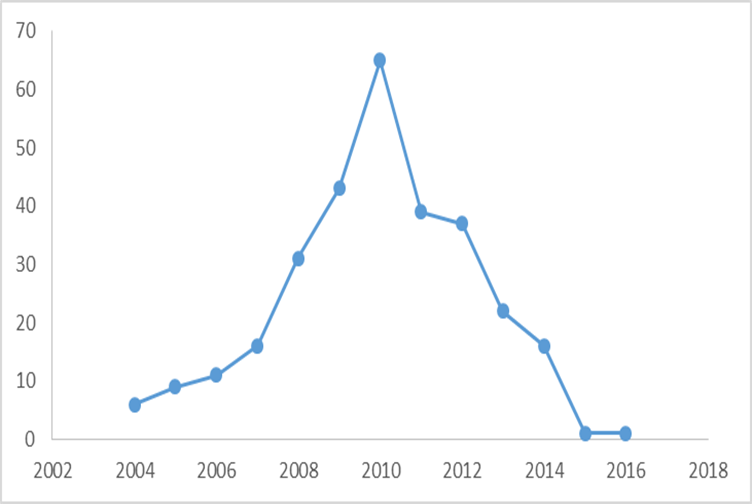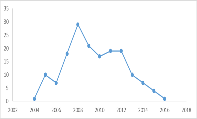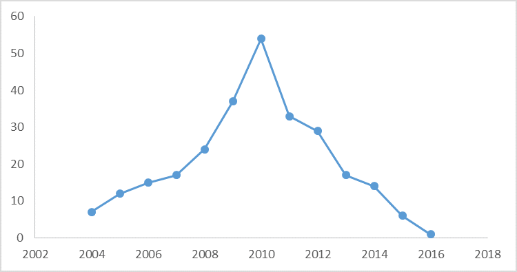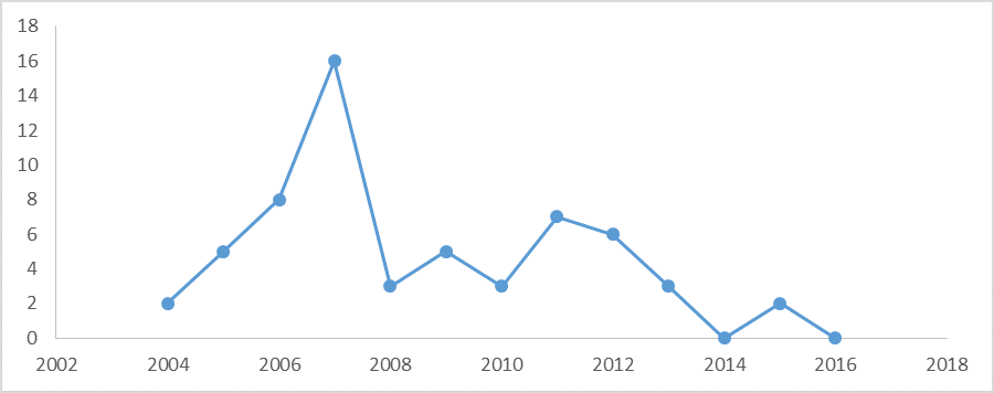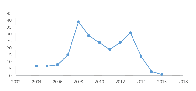 No banco de dados da base USPTO há 297 pedidos de depósito de patentes no intervalo de 01-01-2004 a 31-08-2016 (Figura 4). Observa-se que no intervalo de 2004 a 2010 houve um crescimento no número de pedido de depósito de patentes; em 2011 nota-se um decréscimo que permanece até 2015, saindo de 65 e chegando a apenas um depósito entre 2015 e 2016.