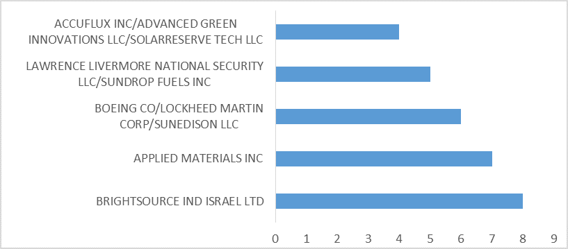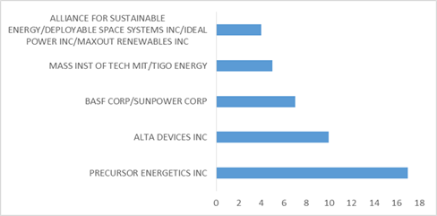 Dentre as principais empresas depositantes de pedido de patentes no USPTO, destaca-se a PRECURSOR ENERGETICS, INC., empresa que fabrica materiais furtivos que têm aplicações industriais, incluindo a energia fotovoltaica de película fina, com 17 depósito de pedido de patentes. Em seguida, com 10 pedidos vem a ALTA DEVICES INC., que fabrica tecnologias solar de junção única, onde oferece uma tecnologia fina e flexível de energia móvel para uso em sistemas não-tripulados, sensores automotivos e exploração remota. Já as empresas ALLIANCE FOR SUSTAINABLE ENERGY, DEPLOYABLE SYSTEMS INC, IDEAL POWER INC e MAXOUT RENEWABLES INC, possuem 4 pedidos de depósitos de patentes cada (Figura 5).