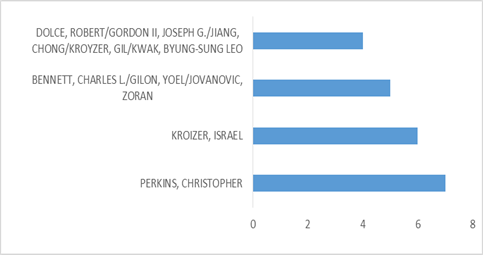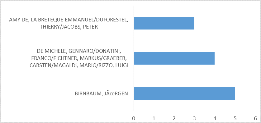 Dentre os 10 maiores inventores citados na Figura 10, destacam-se Birnbaum com 5 pedidos de depósitos de patentes e Franco Donatini com 4 pedidos, empatado com outros 5 inventores. Franco Donatini é engenheiro e professor de Energia Geotérmica na Universidade de Pisa, responsável pelo desenvolvimento de políticas para fontes renováveis.