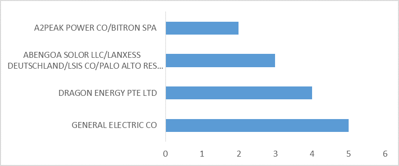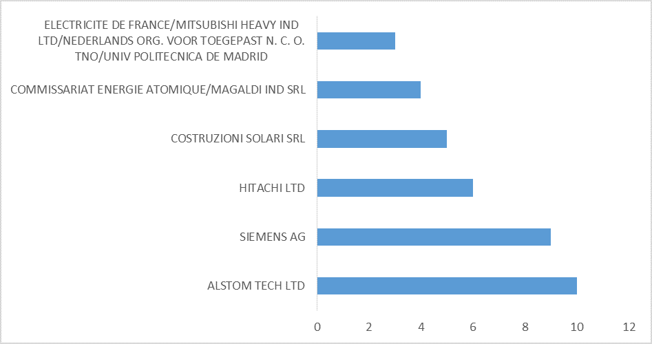 Na Figura 9 estão as 10 empresas que mais fizeram depósitos de patentes, relacionadas a “thermal solar energy”. A vencedora entre as 10 foi a Alstom Technology Ltda., que fabrica equipamentos de usina, estando sediada em Baden, Suíça. Em segundo lugar, com 9 pedidos está Siemens AG, que faz parte de um conglomerado industrial alemão, sendo o maior da Europa e um dos maiores do mundo.